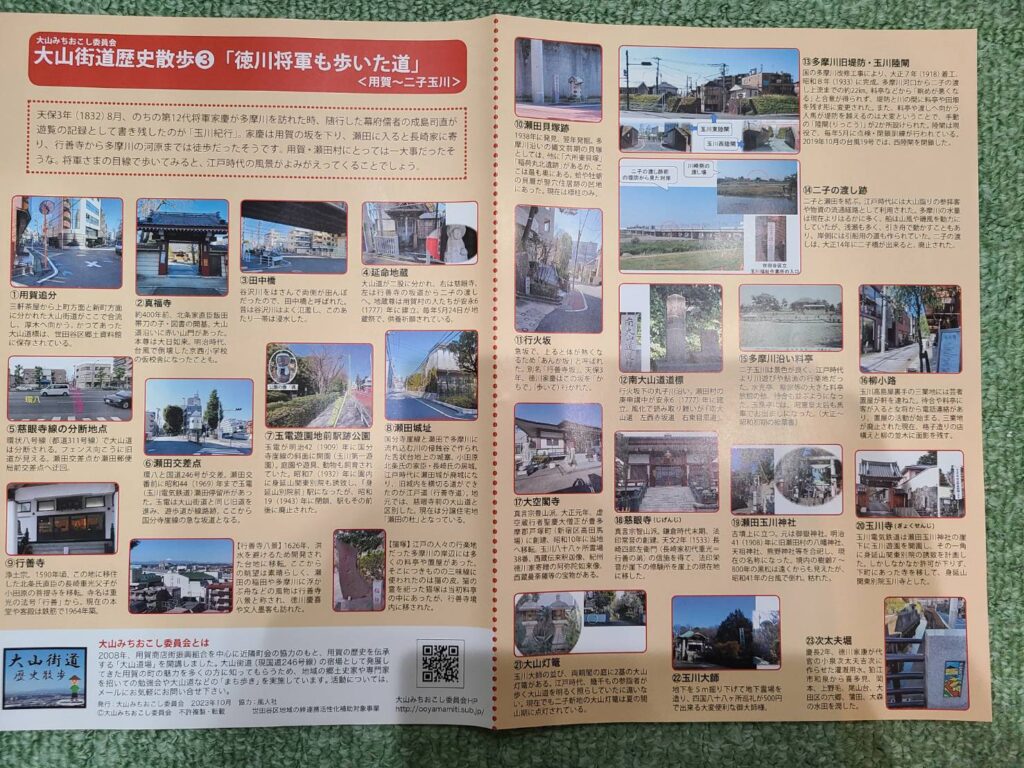大山街道歴史散歩③「徳川将軍も歩いた道」用賀~二子玉川 パンフレット 2024.03.10 パンフレットを作成しました。 用賀まちづくりセンター、玉川台区民センター、用賀商店街振興組合事務所にて配布しています。